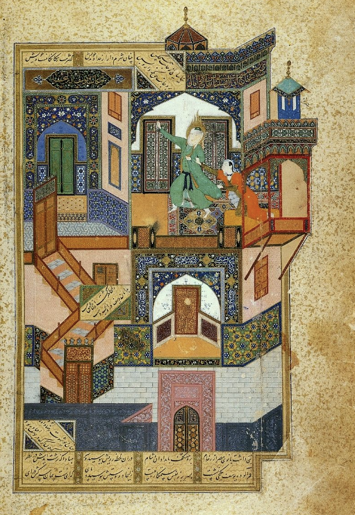 Kamal al-Din Behzad – The Flight of Joseph from Zoleikha (893 AH). This painting vividly illustrates the architectural complexity of Zoleikha’s palace, reflecting the multifaceted nature of her desire. The intricate design of the palace, with its zigzagging stairs and geometric patterns, embodies the labyrinthine journey Joseph must navigate to evade Zoleikha’s advances. The vibrant use of color—emerald green and cinnabar red—serves as a visual metaphor for the contrasting qualities of Joseph’s purity and Zoleikha’s sensuality. Behzad’s portrayal underscores the transformation of Zoleikha’s desire into a complex, almost architectural structure, where her yearning manifests through the elaborate and obstructive pathways Joseph must traverse: a profound visual counterpart to Zoleikha’s shift of demand into a her ultimate object of longing: desire.